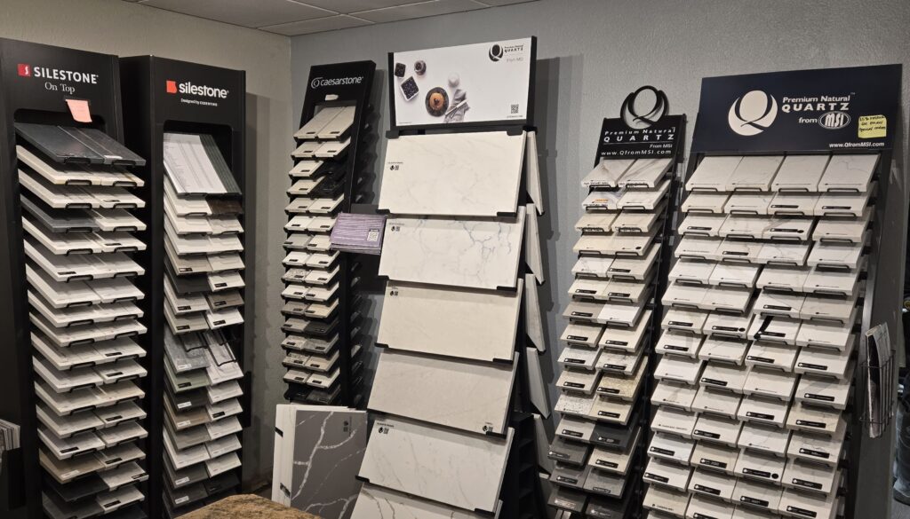 We stock a large selection of granite and quartzite slabs right here in Central Point. You can see the colors, patterns, and movement for yourself instead of guessing from samples.